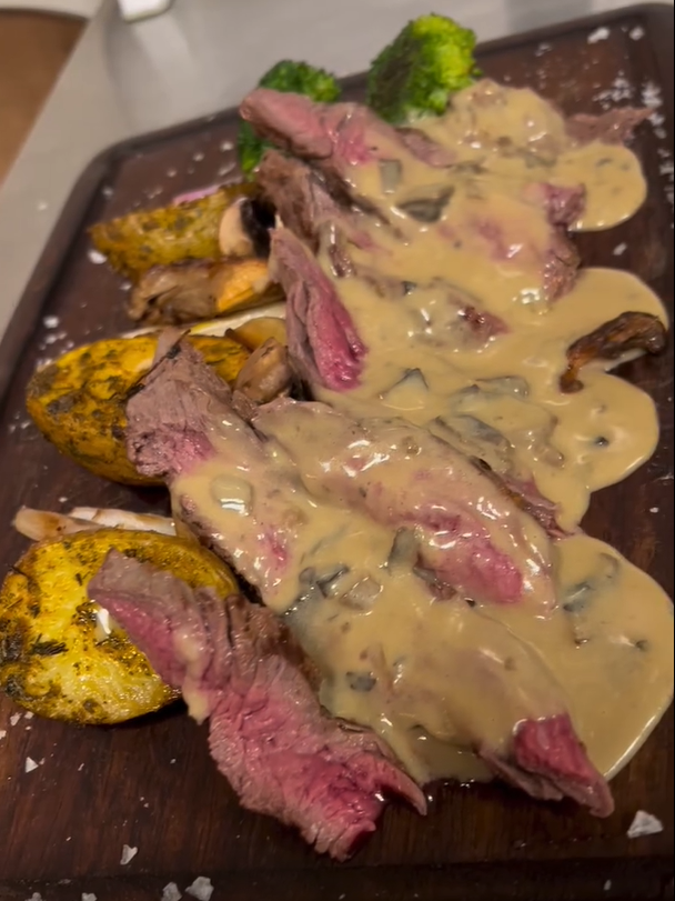 - Premium T-bone-stek som er blitt lufttørket i 21 dager, servert med sesongens grønnsaker, ovnstekte potetbåter og valgfri saus.
