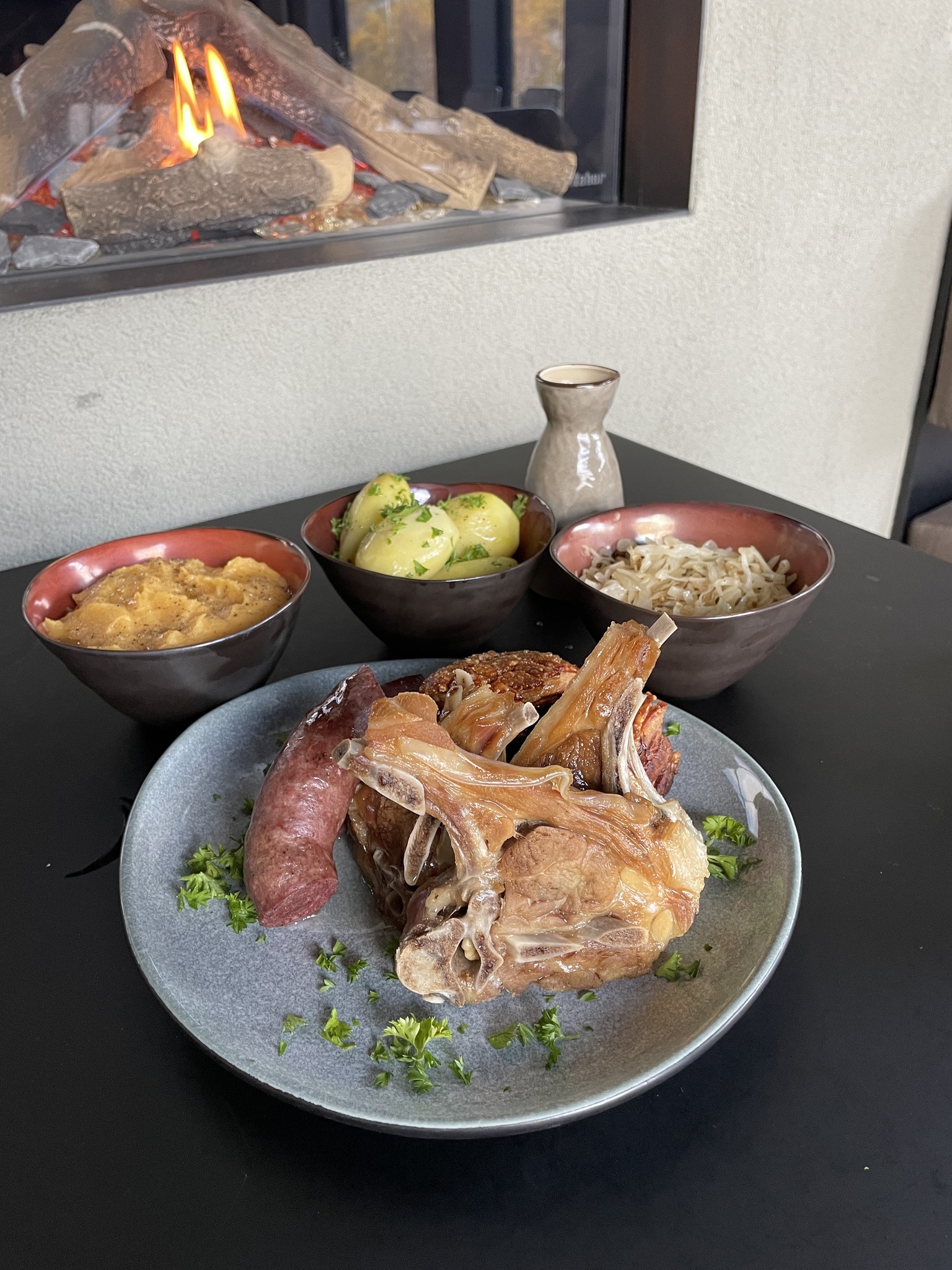 - Pinnekjøtt med kålrabbestappe, rosenkål, sjysaus og mandelpotet