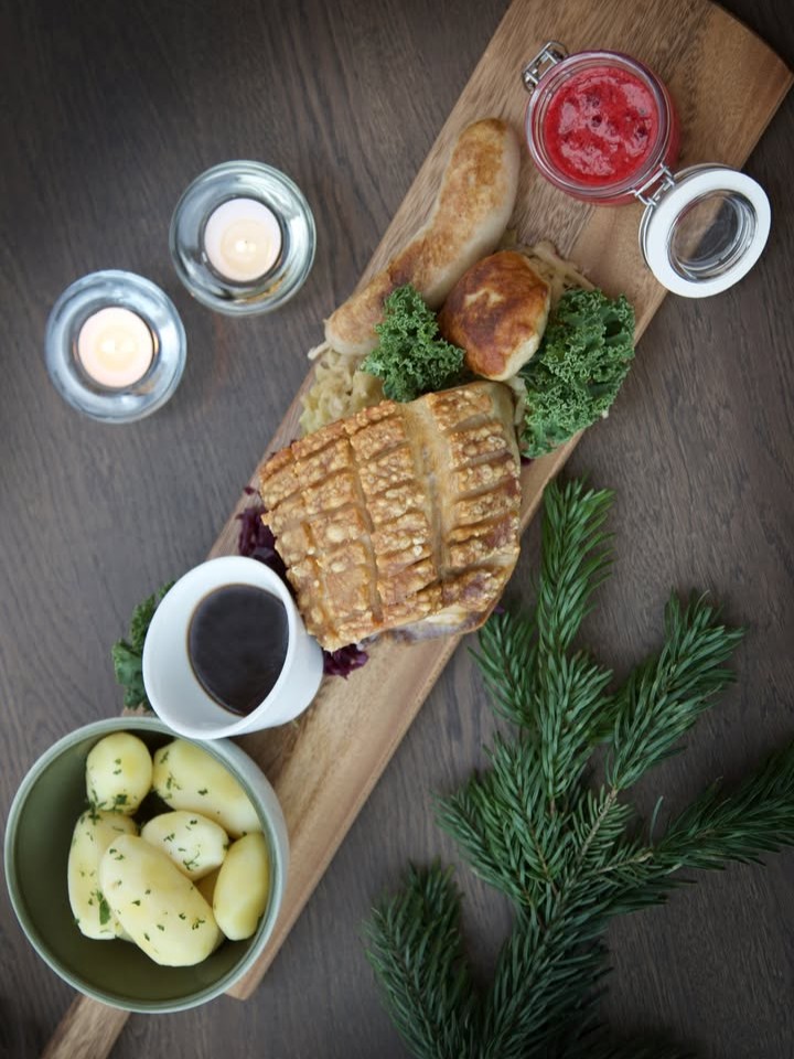 - Juleribbe med rødkål, sjysaus og mandelpotet