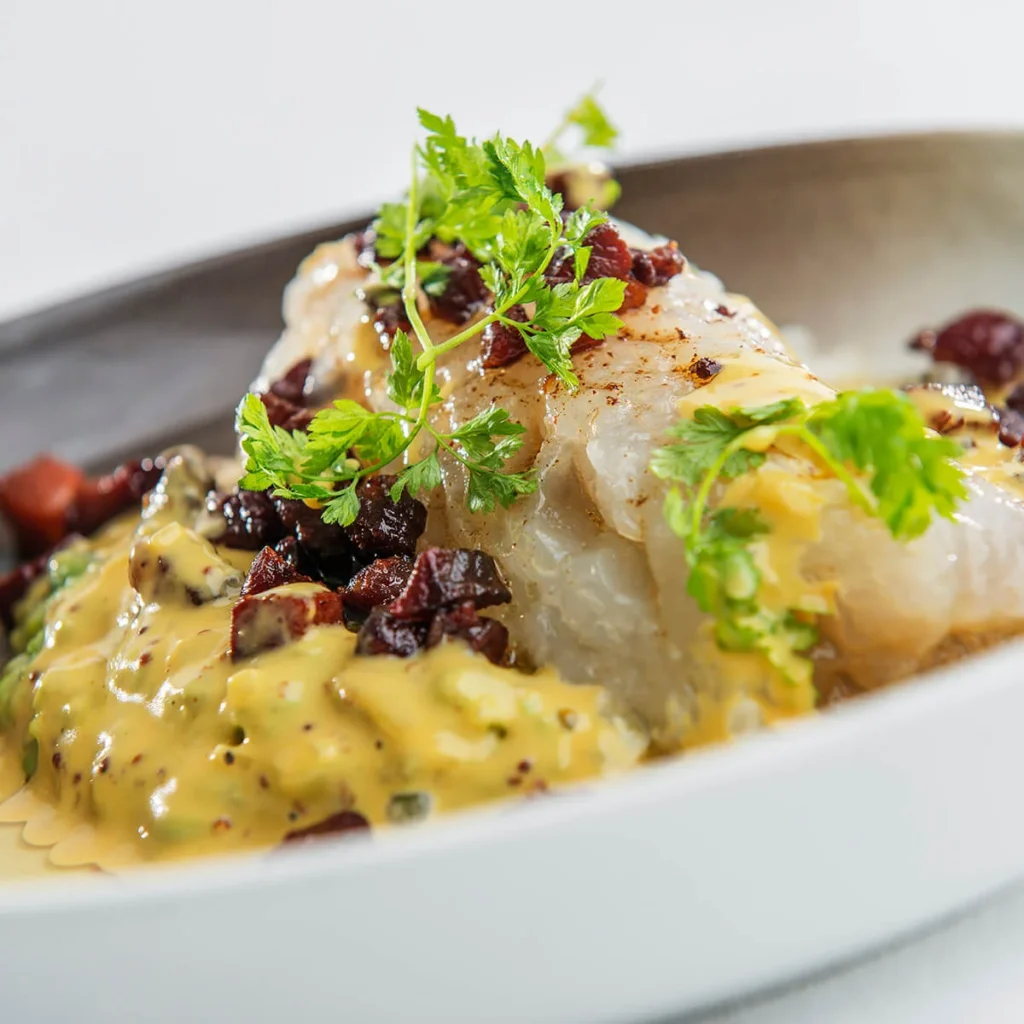 Lutefisk med ertestappe, bacon fra Idsøe, kokte mandelpoteter og sennepsaus