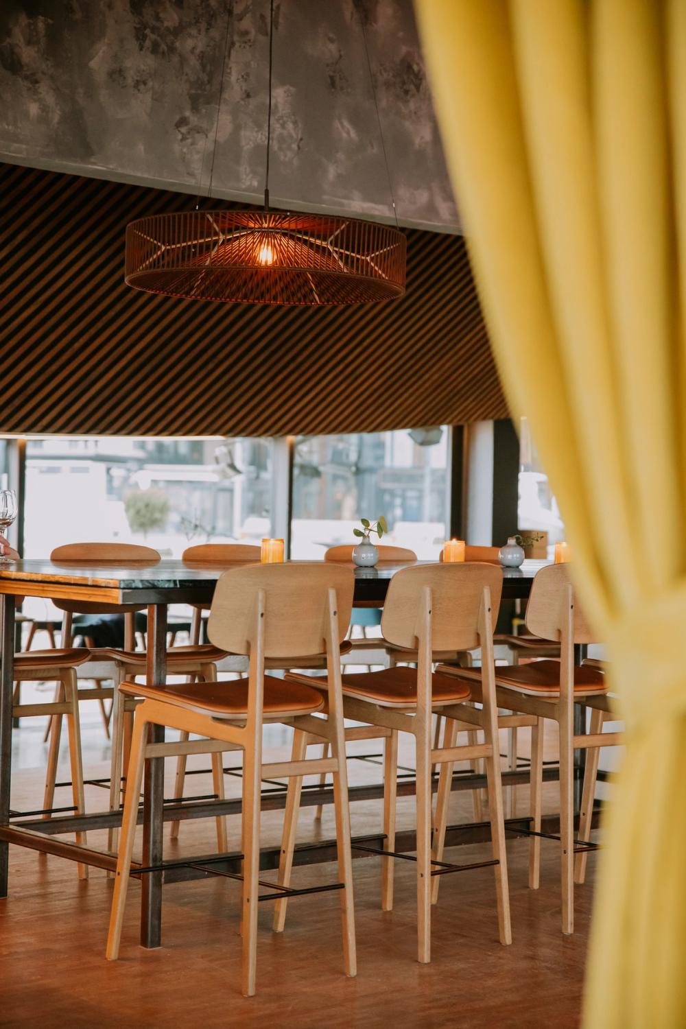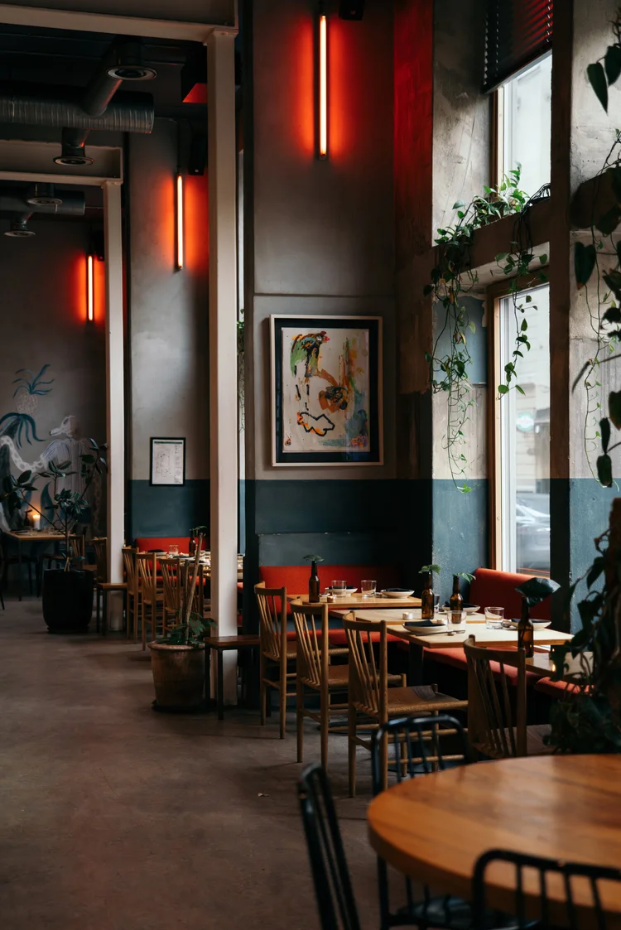 Innenfor restauranten er utsmykkingen både eklektisk og industriell: Rå betongvegger, abstrakte malerier, ildrøde lysrør, klassiske tremøbler, røde stoffsofatrekk og grønne planter. Med sin åpne kjøkkenløsning er det ingenting som hindrer deg fra å se og lukte med på tilblivelsen av de spennende rettene. Ønsker du heller å sitte ute i det fri, er dette også mulig på de solrike dagene.