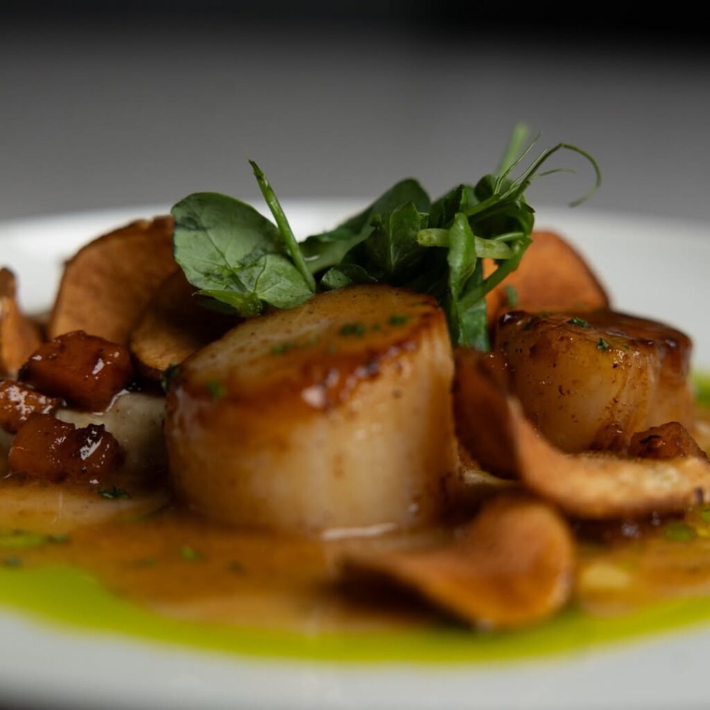 - Pannestekte kamskjell med blomkål, trøffelolje, eple, nøtter, brunet smør og kyllingsjy