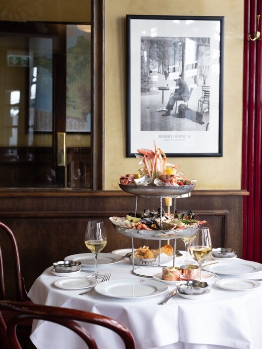 Her får du følelsen av å være på en parisiansk restaurant med det samme blikket møter fasaden: En art nouveau-typisk front med vinrøde vinduslister, og tett-i-tett med små kafébord omgitt av lyse flettestoler. Innenfor er det antikke luksus-vibber som råder; med buede speilrammer, mørkt treverk, brune skinnsofaer, gyllne detaljer og kritthvite duker.
