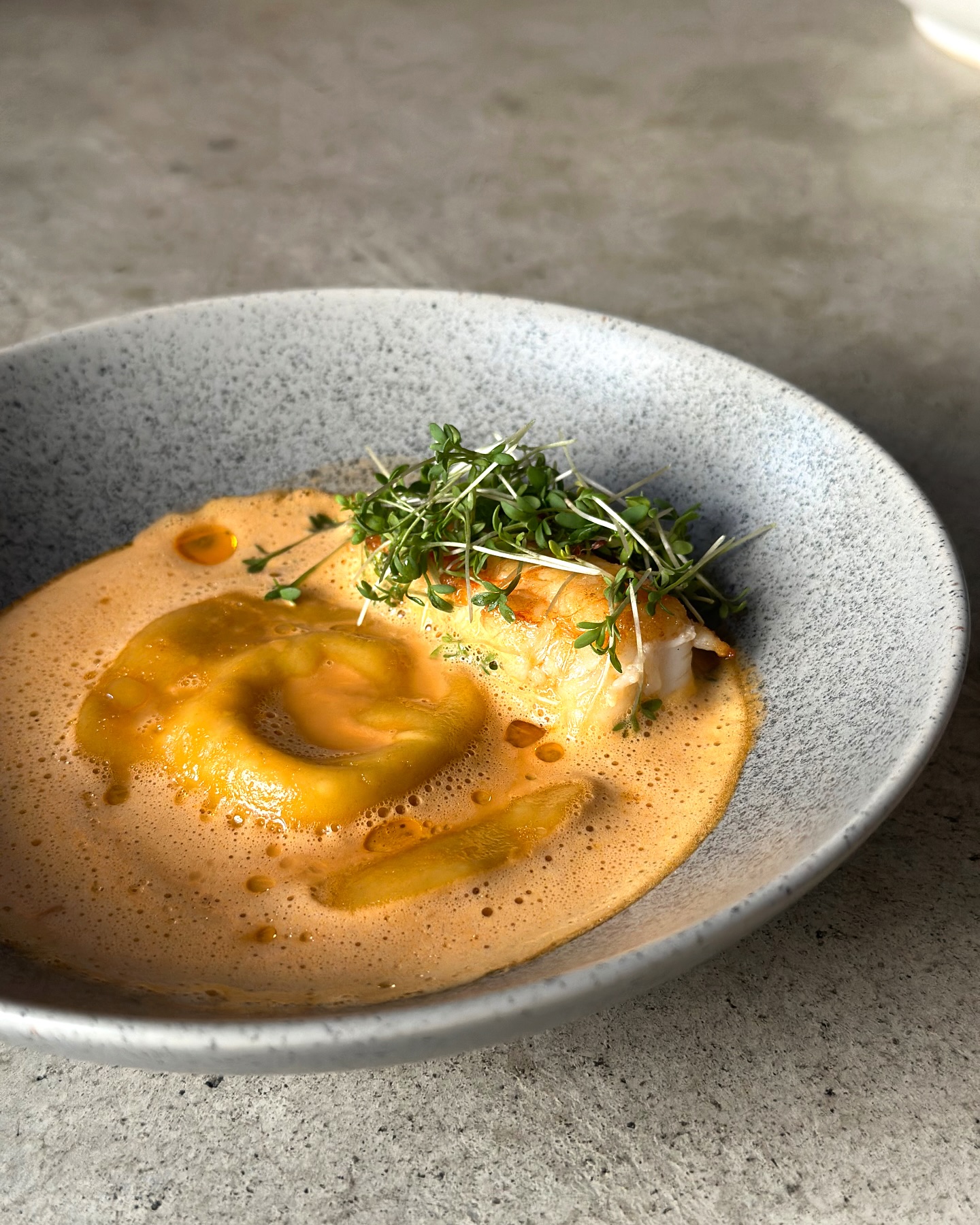 - Hovedrett: Andebryst i grønn chili- og koriandersaus med karri-olje