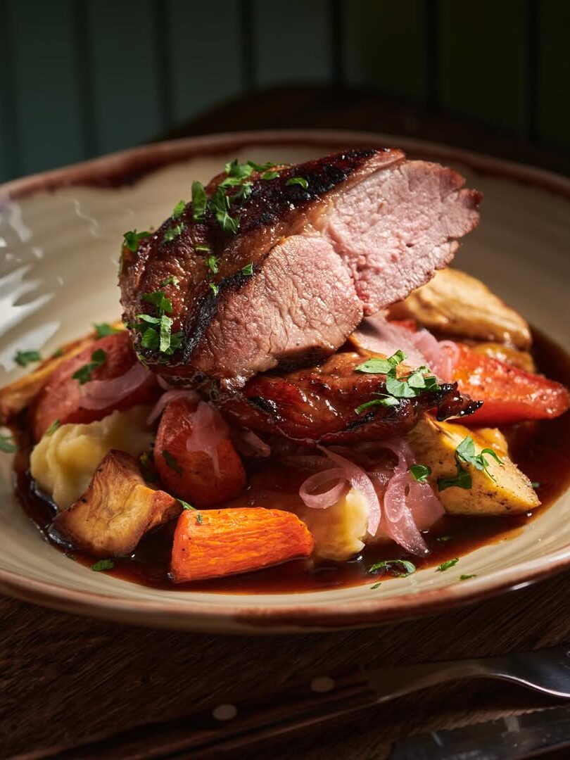 Hovedrett: Stout-marinert svinenakke med hjemmelaget potetstappe, rotgrønnsaker, syltet rødløk og Stoutsaus