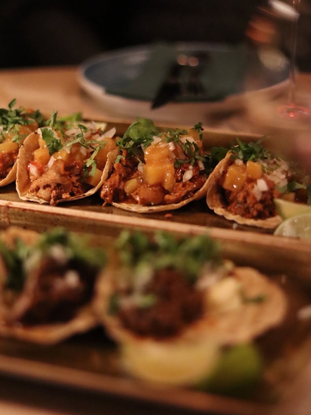 - “Al Pastor” (marinert grillet svinekjøtt med ananaschutney, koriander og løk)